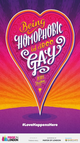 Another design that incurred the wrath of right-minded observers was the one pictured on the left. One might, I’m sure, argue that this ‘play on words’, linking ‘homophobia’ with ‘gay’ is clever, thought-provoking, amusing even. To many, however, it will merely serve to reinforce the acceptability of what many of us have been fighting against for the longest time – the casual wielding of the word ‘gay’ as a weapon of insult and mockery. What’s more, those constantly keeping watch for chinks in our community’s armour will seize upon this as justification for their own homophobic behaviour: ‘if they do it themselves, then why can’t I?’ It’s so predictable, so obvious, and yet was still rubber stamped by the Pride in London board. The mind truly boggles.